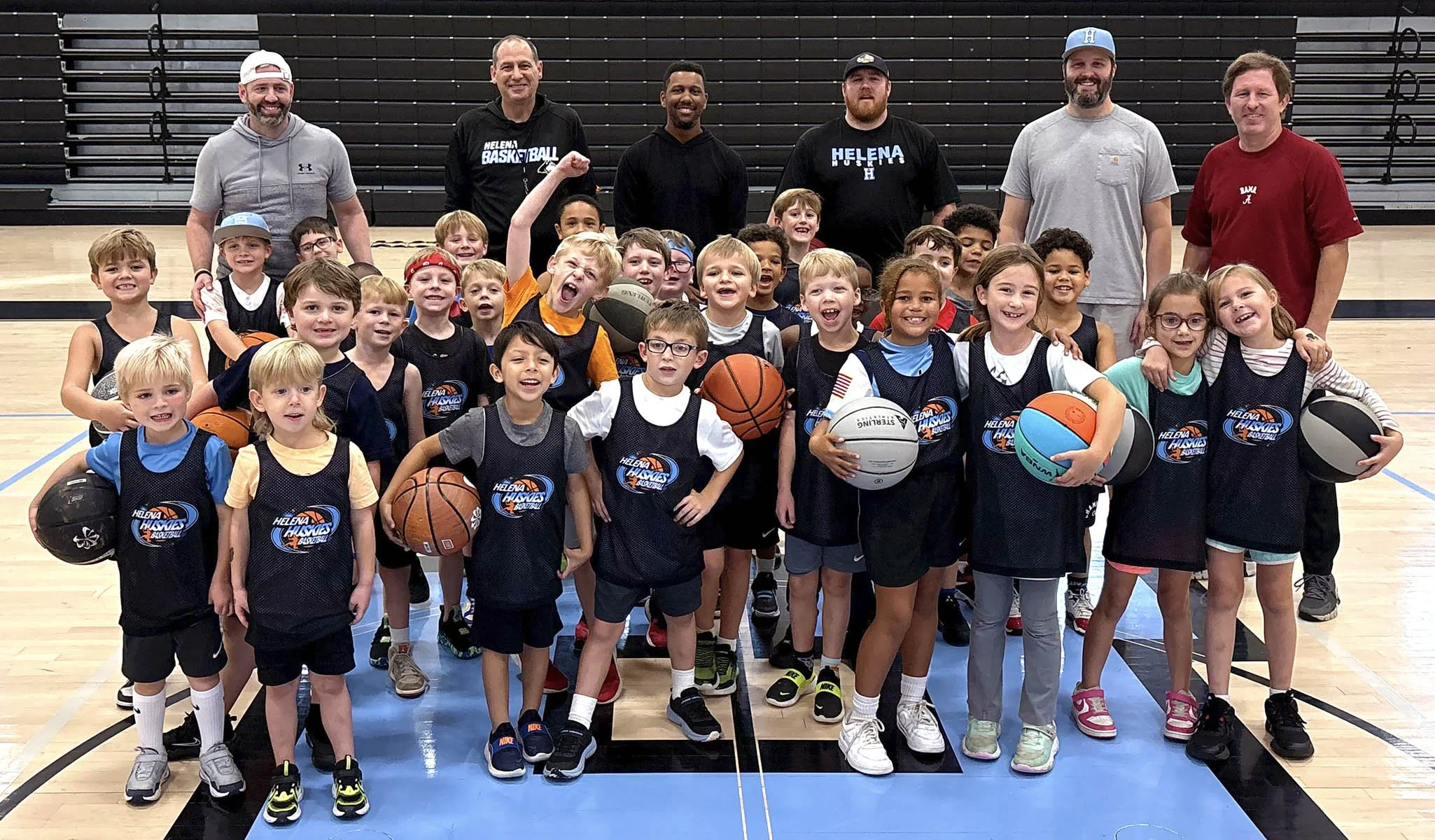 Husky Hoops 6th grade basketball team roster with list of players and coach on a black background with a Husky logo at the top